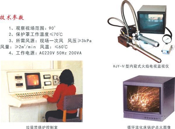 HJY-Ⅳ型內(nèi)窺式火焰電視監(jiān)視儀是用于監(jiān)測(cè)爐內(nèi)照度較低的循環(huán)流化床鍋爐及垃圾焚燒爐爐內(nèi)物料狀態(tài)的彩色工業(yè)電視系統(tǒng),該產(chǎn)品是我公司技術(shù)人員與光學(xué)研究所部分科技人員專門針對(duì)循環(huán)流化床鍋爐和垃圾焚燒爐而共同開發(fā)研制的,只要光照度大于10LUX的環(huán)境條件即能清晰成像,在國內(nèi)處于領(lǐng)先地位。對(duì)于循環(huán)流化床鍋爐,因?yàn)闋t內(nèi)為密封狀態(tài),在點(diǎn)火及投料過程中極易造成高溫或低溫結(jié)焦,而爐內(nèi)照度又很低,用國內(nèi)現(xiàn)有的爐膛火焰監(jiān)視裝置看不到爐內(nèi)物料狀態(tài)。如采用HJY-Ⅳ型產(chǎn)品可看到爐內(nèi)物料狀態(tài)并指導(dǎo)投料并及時(shí)發(fā)現(xiàn)結(jié)焦趨勢(shì),從而避免結(jié)焦或投料過多造成點(diǎn)火過程中滅火。而垃圾焚燒爐,由于污染問題,爐體為密封式,投料后極易將火壓滅,即使在燃燒時(shí),爐內(nèi)照度也非常低,通常在300LUX以下,而國內(nèi)常規(guī)產(chǎn)品需在500LUX照度下才能工作。所以只有采用HJY-Ⅳ型產(chǎn)品,才能指導(dǎo)投料及探針插孔并在遠(yuǎn)離現(xiàn)場(chǎng)的操作室內(nèi)清晰看到爐內(nèi)的垃圾焚燒狀態(tài),從而實(shí)現(xiàn)安全經(jīng)濟(jì)運(yùn)行。